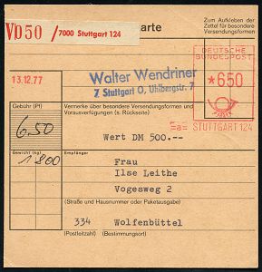 3550 | 18 € | 7000 Stuttgart Maschinen-Postfreistempel : =a= STUTTGART 124 1977 (13.12.) Paket-PFS Francotyp "Posthorn" *650 Pf. + roter Wertpaket-Zettel: 7000 Stuttgart 124 , Inl.-Wertpaketkt. n. Wolfenbüttel, rs. AS. (Dü.H-6 A) | ![]() ![]() | |