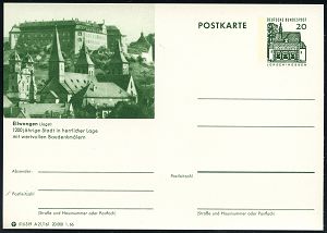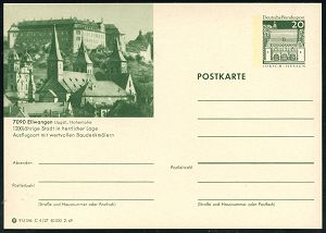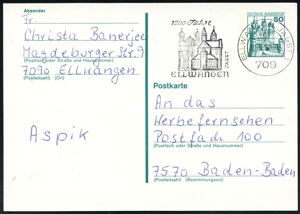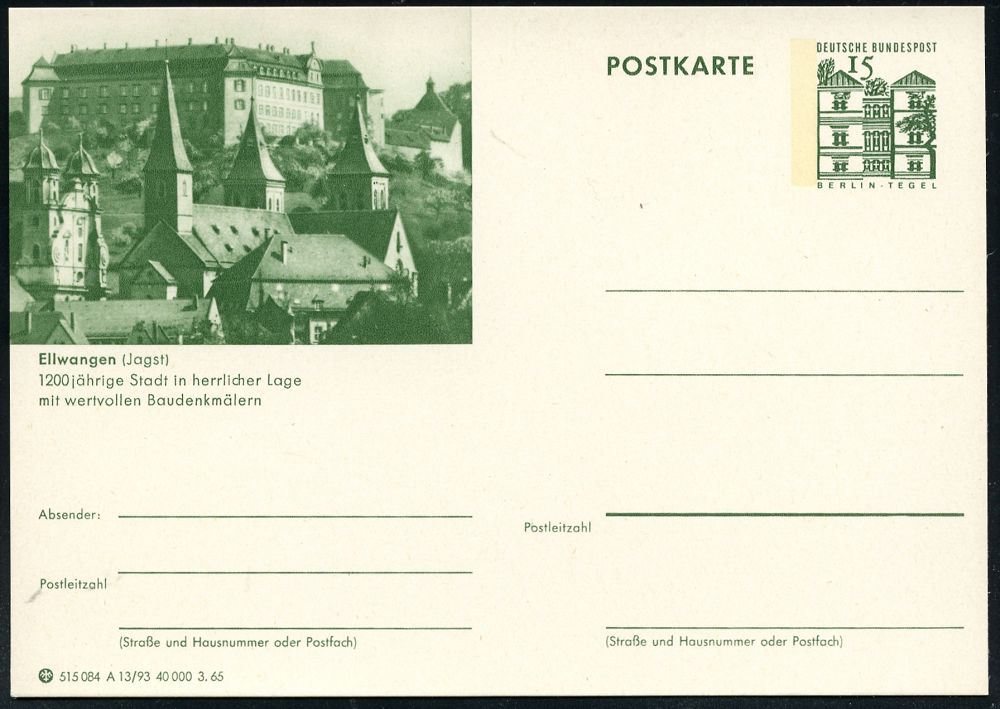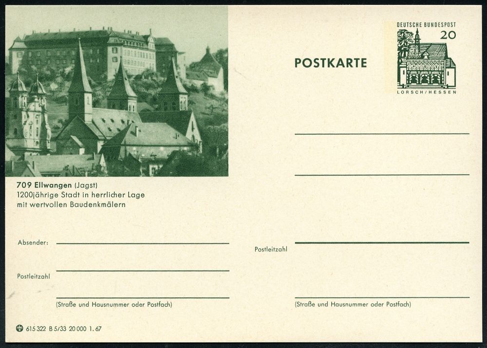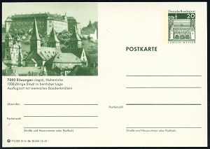 3781 | 5 € | POSTLEITRAUM 7000 (OHNE STUTTGART) : 709 ELLWANGEN,JAGST 1/ 1200 Jahre 1980 (20.9.) MWSt (Kloster-u. St.Veit-Basilika) Bedarf (Bo.6 A II) | ![]() | |