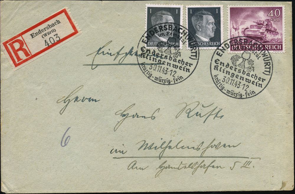 3786 | 20 € | POSTLEITRAUM 7000 (OHNE STUTTGART) : ENDERSBACH (WÜRTT)/ im Remstal/ Enderbacher/ Klingenwein.. 1943 (30.11.) HWSt = Weintraube, -Pokal 2x klar + RZ: Endersbach/(Württ), Inl.-R-Bf. (Bo.1 , Bochmann 1943 unbekannt!) | ![]() | |