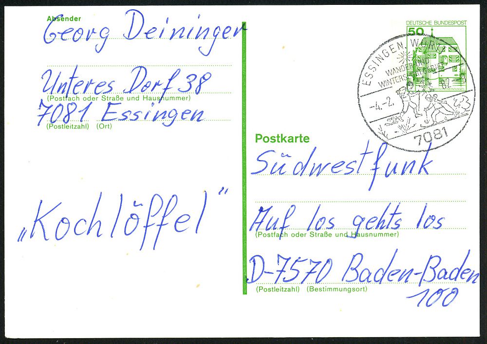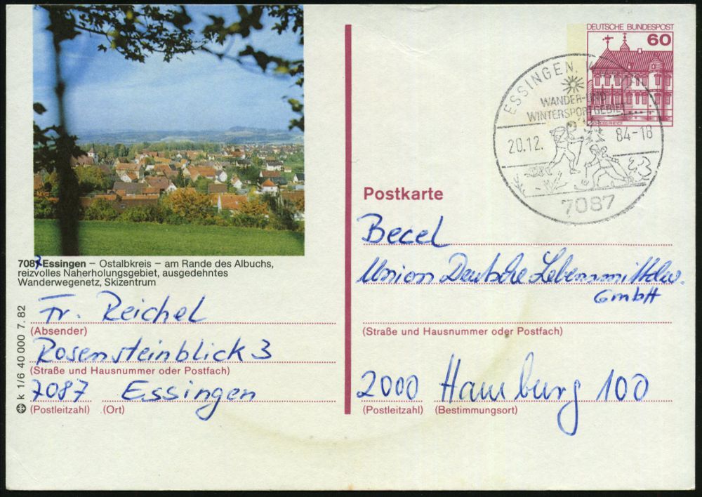 3787 | 6 € | POSTLEITRAUM 7000 (OHNE STUTTGART) : 7081 ESSINGEN,WÜRTT/ WANDER-U./ WINTERSPORTGEBIET 1982 (4.2.) HWSt = Ski-Langläufer (u. Wanderer) Bedarfs-Kt. | ![]() | |