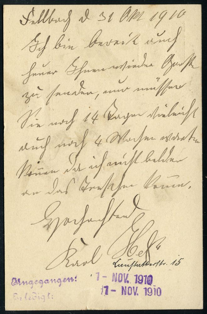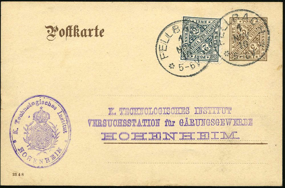 3789 | 20 € | POSTLEITRAUM 7000 (OHNE STUTTGART) : HOHENHEIM/ K.TECHNOLOG.INSTITUT/ VERSUCHSSTATION für GÄRUNGSGEWERBE 1907 (Nov.) viol. 3L + viol.HdN a.Dienst-P Württembg. 3 Pf. braun + 2 Pf. Dienst Zusatzfrankat. als Antwort-Kt., Aufgabe 1K: FELLBACH/**, (Mi.DP 34) | ![]() ![]() | |