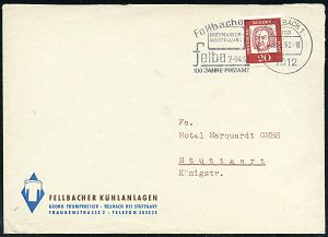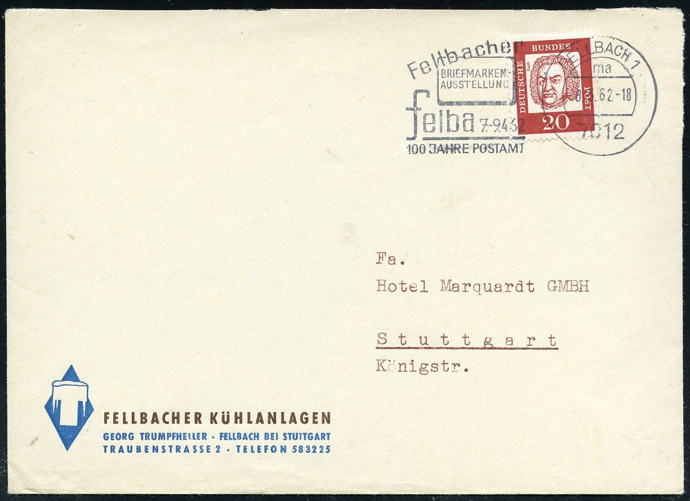 3800 | 10 € | POSTLEITRAUM 7000 (OHNE STUTTGART) : 7012 FELLBACH 1/ ma/ ..felba 7.-9.4.62/ 100 JAHRE POSTAMT 1962 (8.3.) MWSt , klar gest. Firmenbf.: FELLBACHER KÜHLANLAGEN GEORG TRUMPFHELLER.. | ![]() | |