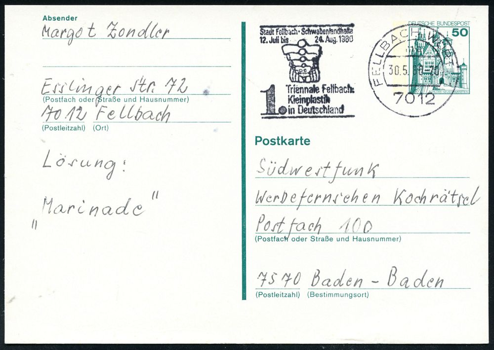 3805 | 5 € | POSTLEITRAUM 7000 (OHNE STUTTGART) : 7012 FELLBACH,WÜRTT 1/ ma/ 1.Triennale Fellbach/ Kleinplastik.. 1980 (18.7.) MWSt (= 4 Torsi gestafflet) , klar gest. Bedarfs-Kt. (Bo.63 A) | ![]() | |