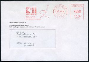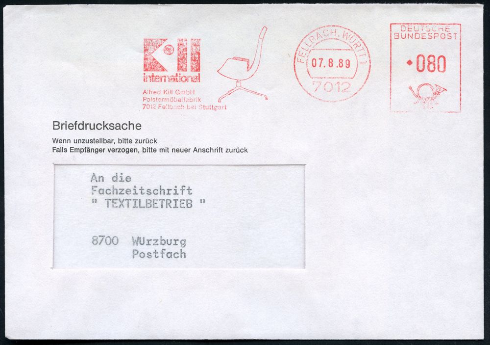 3806 | 8 € | POSTLEITRAUM 7000 (OHNE STUTTGART) : 7012 FELLBACH,WÜRTT 1/ Kill/ international/ ..Polstermöbelfabrik 1989 (7.8.) AFS Francotyp (Drehsessel) Inl.Bf. (Dü.E-26) | ![]() | |