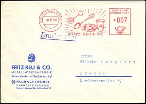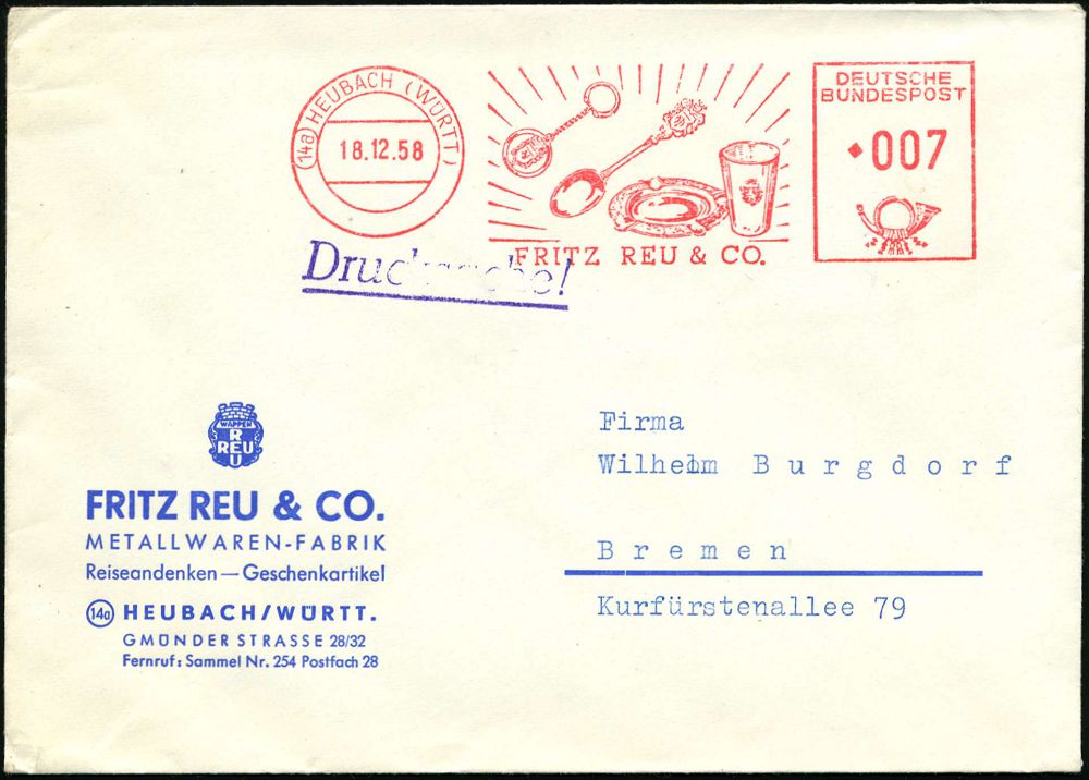 3814 | 15 € | POSTLEITRAUM 7000 (OHNE STUTTGART) : (14a) HEUBACH (WÜRTT)/ FRITZ REU & CO 1958 (18.12.) dekorativer AFS Francotyp (silberne Schlüsselanhänger, Löffel, Aschenbecher, Trinkbecher) Firmen-Bf. (Dü.E-23CO) | ![]() | |
