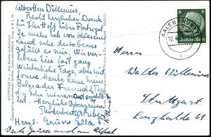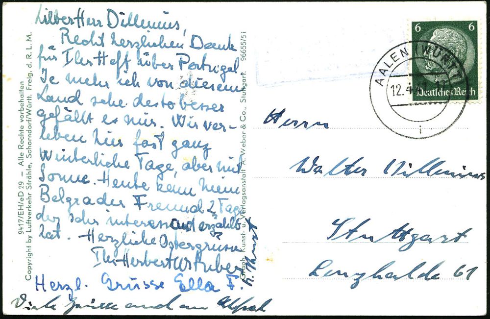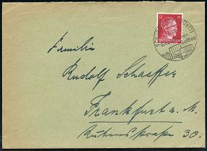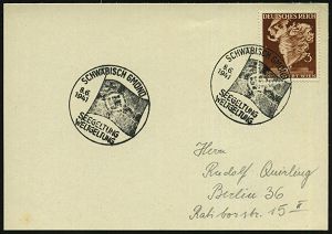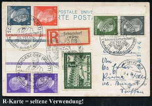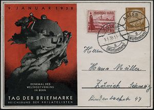 3741 | 28 € | POSTLEITRAUM 7000 (OHNE STUTTGART) : AALEN/ g/ (Württemberg) 1938 (9.1.) 1K-Brücke auf PP 3 Pf. Hindenbg., braun: TAG DER BRIEFMARKE.. = UPU-Denk-mal Bern (rot = PP 122/C 70-02) + Zusatzfrankat. 12+6 Pf. WHW, portorichtige Bedarfs-Ausl.-Kt. mit viel Text!, seltene Verwendung! | ![]() | |