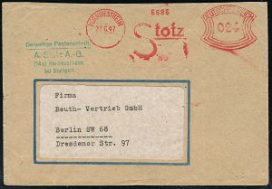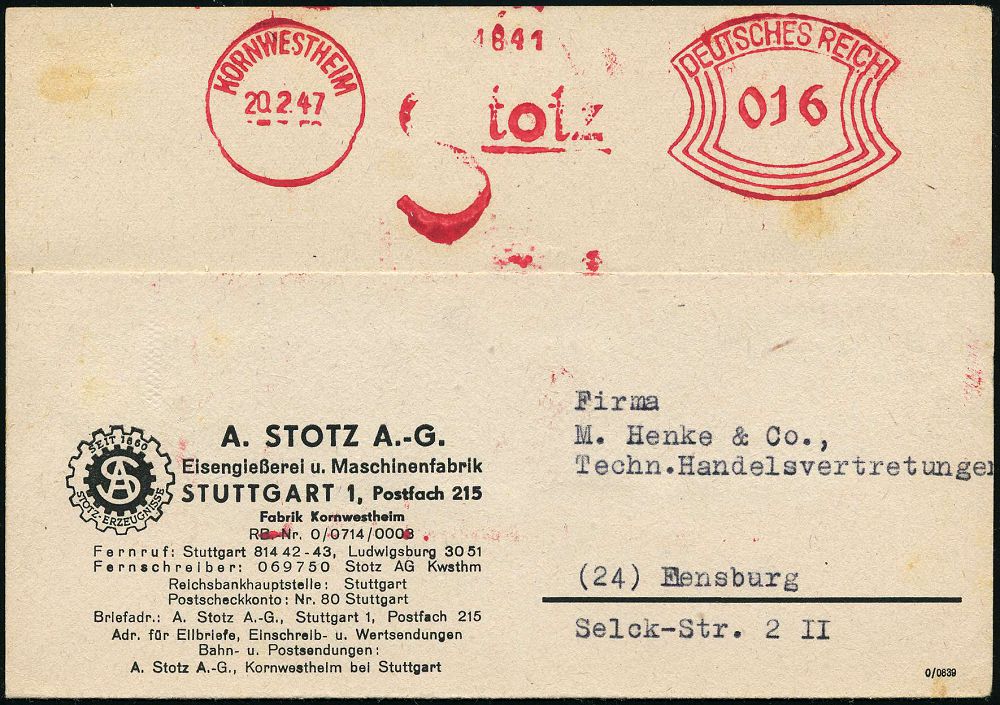 3818 | 25 € | POSTLEITRAUM 7000 (OHNE STUTTGART) : KORNWESTHEIM/ Stotz 1947 (20.2.) AFS Francotyp "Bogenrechteck" DEUTSCHES REICH unverändert weiterverwendet , Firmenkt.: A. STOTZ AG/Eisengießerei u. Maschinenfabrik/STUTTGART.. (Zahnrad-Logo) = noch kriegsbedingt ausgelagerte Fa.! (II. Wk.!) n. Flensburg (Dü.E-1BAh) | ![]() | |