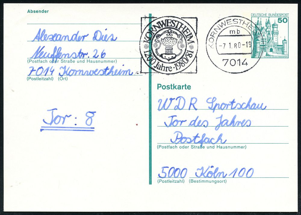 3823 | 5 € | POSTLEITRAUM 7000 (OHNE STUTTGART) : 7014 KORNWESTHEIM 1/ mb/ 1200 Jahre 1980-81 1980 (7.1.) MWSt (Wappen) Bedarf (Bo.5 A) | ![]() | |