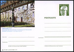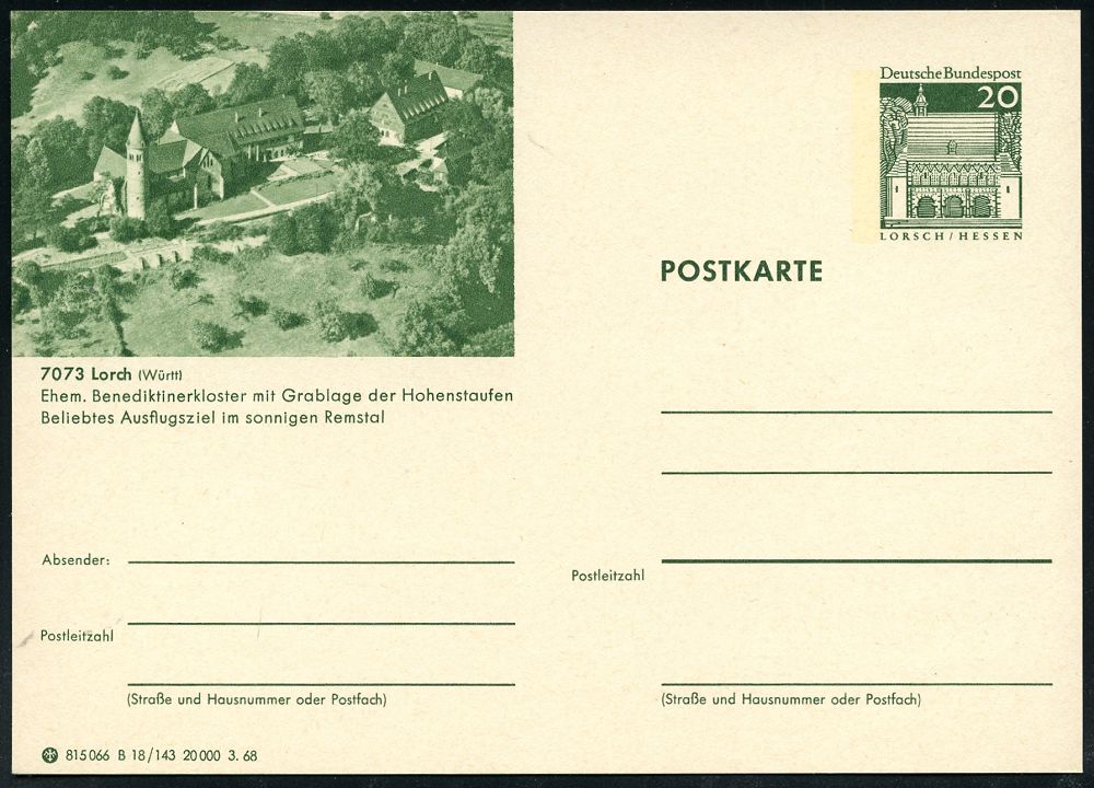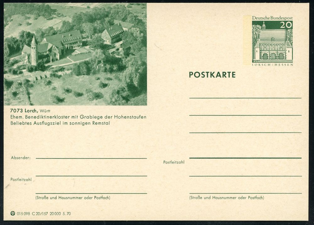 3836 | 8 € | POSTLEITRAUM 7000 (OHNE STUTTGART) : 7073 Lorch,Württ 1970 2 verschiedene 20 Pf. BiP Lorsch: Ehem. Benediktinerkloster..Grablege d.Hohenstaufen.. (Kloster) je ungebr. (Einzelverkauf möglich: je 5.- EUR), 2 Belege (Mi.P 96, P 99) | ![]() ![]() | |