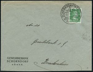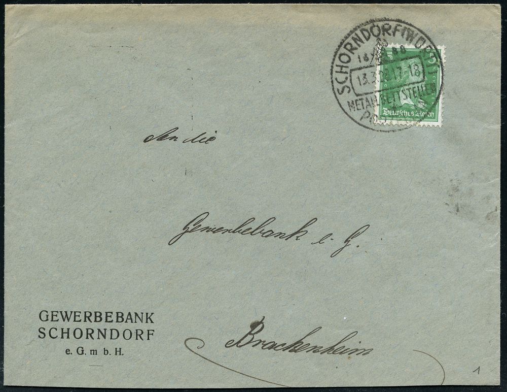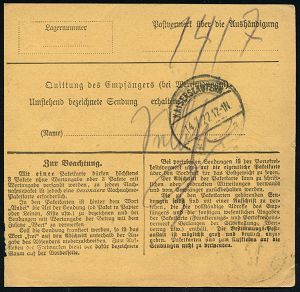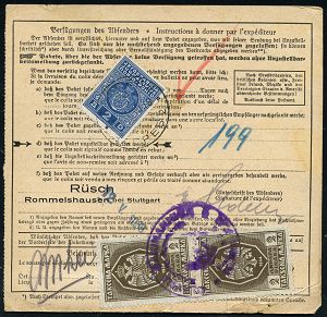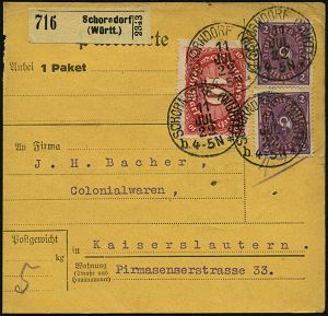 3853 | 14 € | POSTLEITRAUM 7000 (OHNE STUTTGART) : SCHORNDORF (WÜRTT)/ b* 1922 (11.7.) 1K. weiterverwendeter, Württembg.-Stempel mehrfach auf Infla-Frankatur 14.- Mk. + schw. Paketzettel: Schorndorf/(Württ.), Inl.-Paketkt. n. Kaiserslautern (Mi.2x 191, 195) | ![]() ![]() | |