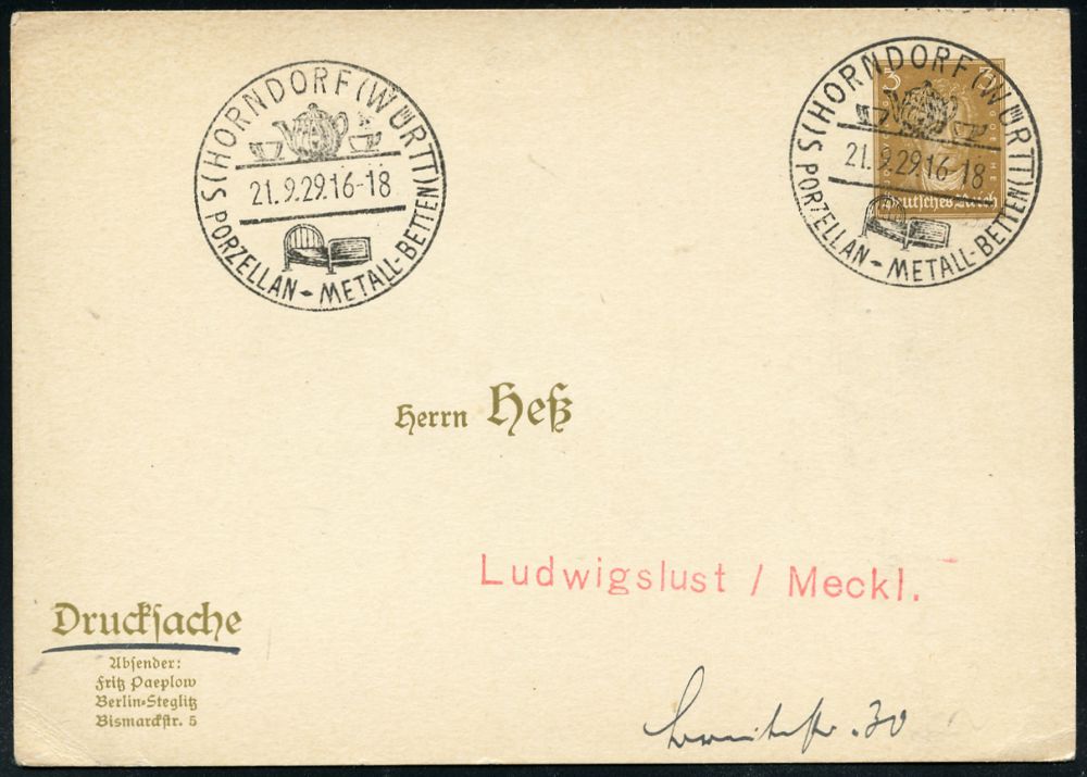 3856 | 20 € | POSTLEITRAUM 7000 (OHNE STUTTGART) : SCHORNDORF (WÜRTT)/ PORZELLAN - METALL-BETTEN 1929 (21.9.) seltener HWSt (Kaffeekanne, Tassen u. Metall-/Bett) auf PP 3 Pf. Goethe, braun: F. Paeplow.. (Mi.PP 97/B 6-02) glasklar gest.! (Bo.2, nur 1929-31 verwendet) | ![]() | |