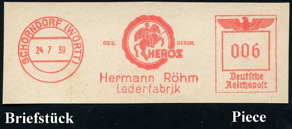 3861 | 8 € | POSTLEITRAUM 7000 (OHNE STUTTGART) : SCHORNDORF (WÜRTT)/ HEROS/ Hermann Röhm/ Lederfabrik 1939 (24.7.) AFS Francotyp "Reichsadler" (Krieger zu Pferd) kleines Briefstück | ![]() | |