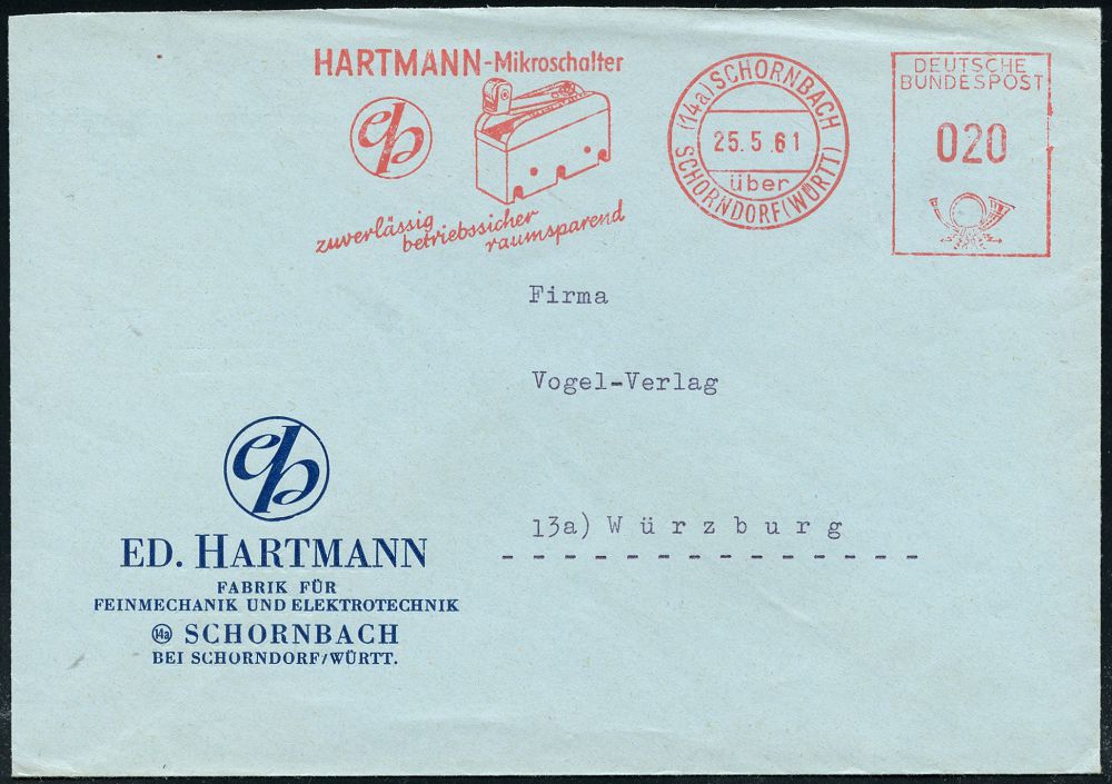 3852 | 12 € | POSTLEITRAUM 7000 (OHNE STUTTGART) : (14a) SCHORNBACH/ über/ SCHORNDORF (WÜRTT)/ HARTMANN-Mikroschalter.. 1961 AFS Francotyp = PSt. I-Typ (Kipp-Schalter) dekorativer Firmen-Bf. (Dü.E-26 alt) | ![]() | |