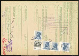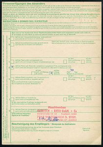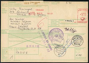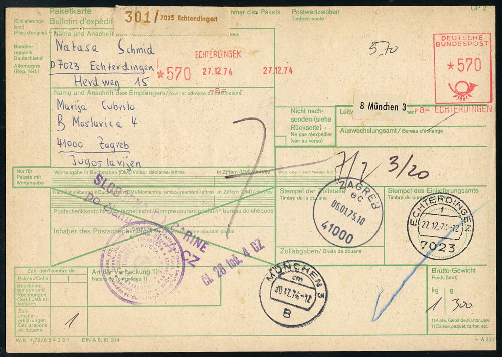 3774 | 16 € | POSTLEITRAUM 7000 (OHNE STUTTGART) : ECHTERDINGEN =a= 1974 (27.12.) Paket-PFS Francotyp *570 Pf. + brauner Paketzettel: 7023 Echterdingen + 1K: 7023 ECHTERDINGEN/f etc., Ausl.-Paketkt. n. Zagreb, vs. AS. (Dü.H-6D) | ![]() ![]() | |