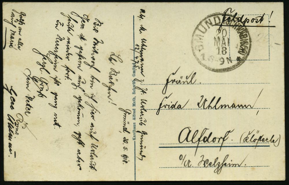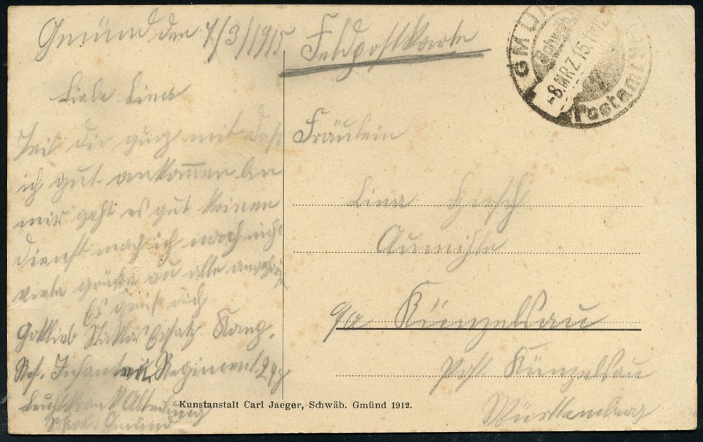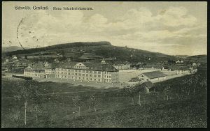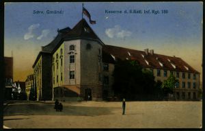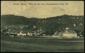 3876 | 12 € | POSTLEITRAUM 7000 (OHNE STUTTGART) : Schwäb.Gmünd 1918 (20.5.) 1K: GMÜND (SCHWÄBISCH)/1* auf Color-Foto-Ak.: Kaserne d. II. Batl. Inf. Rgt. 180 , Feldpost-Kt. n. Alfdorf | ![]() ![]() | |