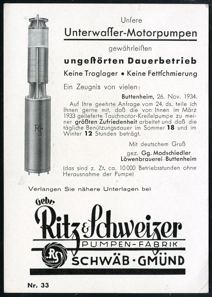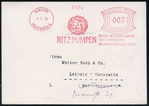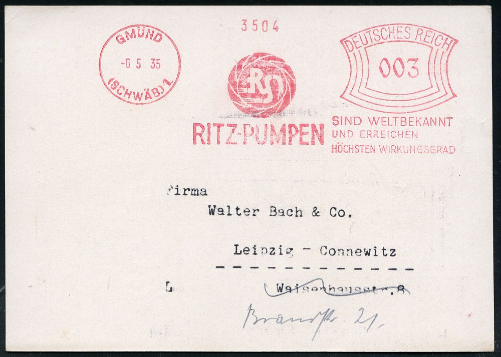 3877 | 20 € | POSTLEITRAUM 7000 (OHNE STUTTGART) : Schwäbisch Gmünd 1935 (6.5.) AFS Francotyp "Bogenrechteck": GMÜND/(SCHWÄB.) 1/ RITZ-PUMPEN/..ERREICHEN/ HÖCHSTEN WIRKUNGS-GRAD (Wasser-Logo als Kreiselpumpe) klar gest. motivgl. Reklame-Ak.: Unterwaaser-Motorpumpe (Dü.E-1CEh) | ![]() ![]() | |