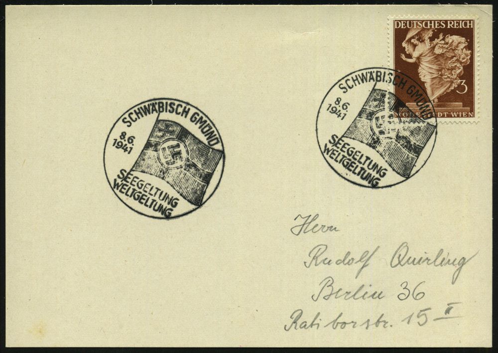 3881 | 15 € | POSTLEITRAUM 7000 (OHNE STUTTGART) : SCHWÄBISCH GMÜND/ SEEGELTUNG/ WELTGELTUNG 1941 (8.6.) SSt = Reichsmarine-Kriegsflagge, klar gest. Inl.-Karte (Bo.5) | ![]() | |