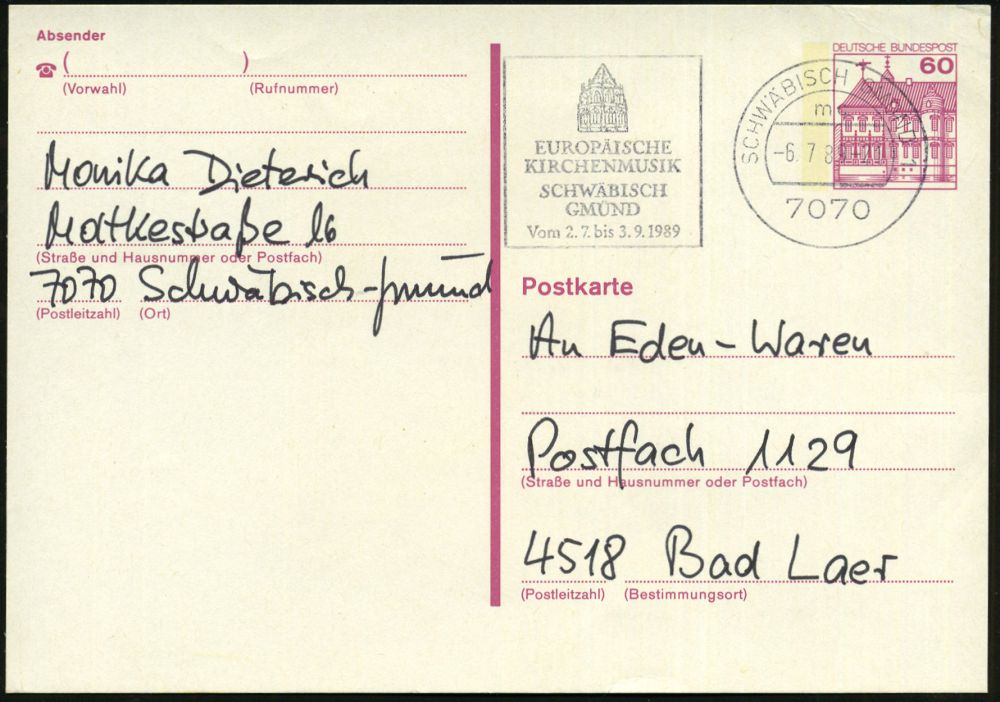 3884 | 6 € | POSTLEITRAUM 7000 (OHNE STUTTGART) : 7070 SCHWÄBISCH GMÜND/ mc/ EUROP./ KIRCHENMUSIK..2.7. bis 3.9. 1989 (6.7.) MWSt = Orgel , Bedarfs-Kt. | ![]() | |