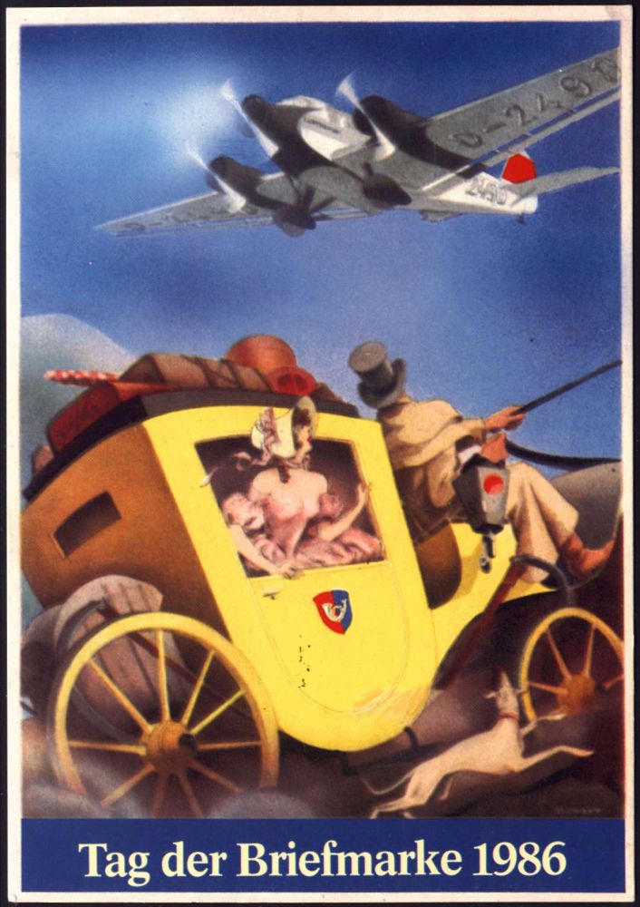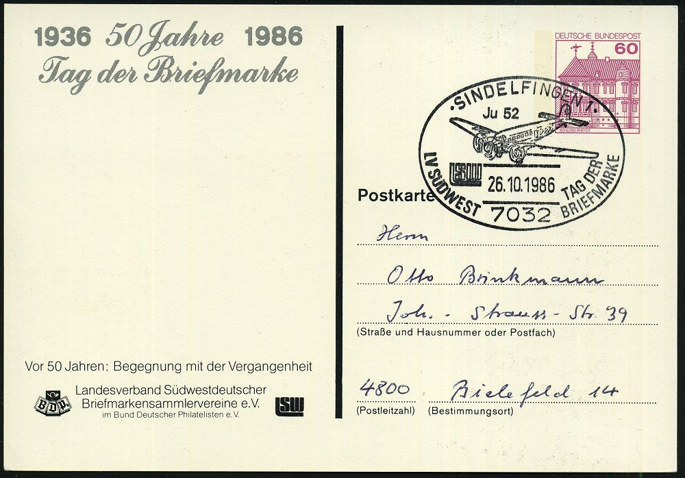 3895 | 12 € | POSTLEITRAUM 7000 (OHNE STUTTGART) : 7032 SINDELFINGEN/ Ju 52/ ..TAG DER/ BRIEFMARKE 1986 (26.10.) SSt = Junkers "Ju 52" auf motivgl. PP 60 Pf. Bauwerke: Tag der Briefmarke (histor. DLH-Plakat: Biedermeier-Kutsche trifft Ju 52; Hakenkreuz überdruckt!) Inl.-Karte (Mi.PP 106/236) | ![]() ![]() | |