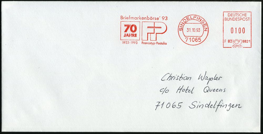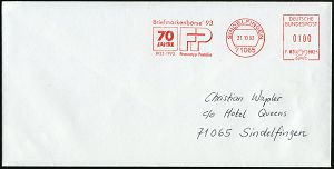 3898 | 16 € | POSTLEITRAUM 7000 (OHNE STUTTGART) : 71065 SINDELFINGEN/ F83 8821/ Briefmarkenbörse´93/ 70/ JAHRE/ FP/ 1923-1993 Francotyp-Postalia 1993 (31.10.) seltener Jubil.-AFS = Messe-Francotyp-Postamt! klar gest. Ortsbf., lt. Postalia Auflage nur 300 Bedarfs-Belege! (Dü.E-26) | ![]() | |