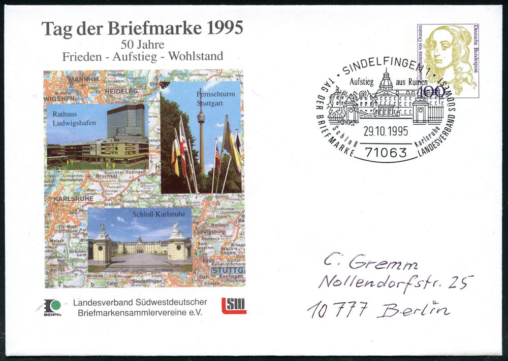 3900 | 12 € | POSTLEITRAUM 7000 (OHNE STUTTGART) : 71063 SINDELFINGEN 1/ Aufstieg aus Ruinen/ Schloß Karlsruhe.. 1995 (29.10.) SSt zum Tag der Briefmarke (Schloßruine, Wiederherstellung) auf motivgl. PU 100 Pf. Luise H.v.Oranien | ![]() | |