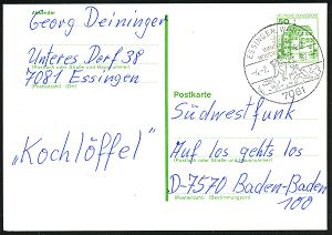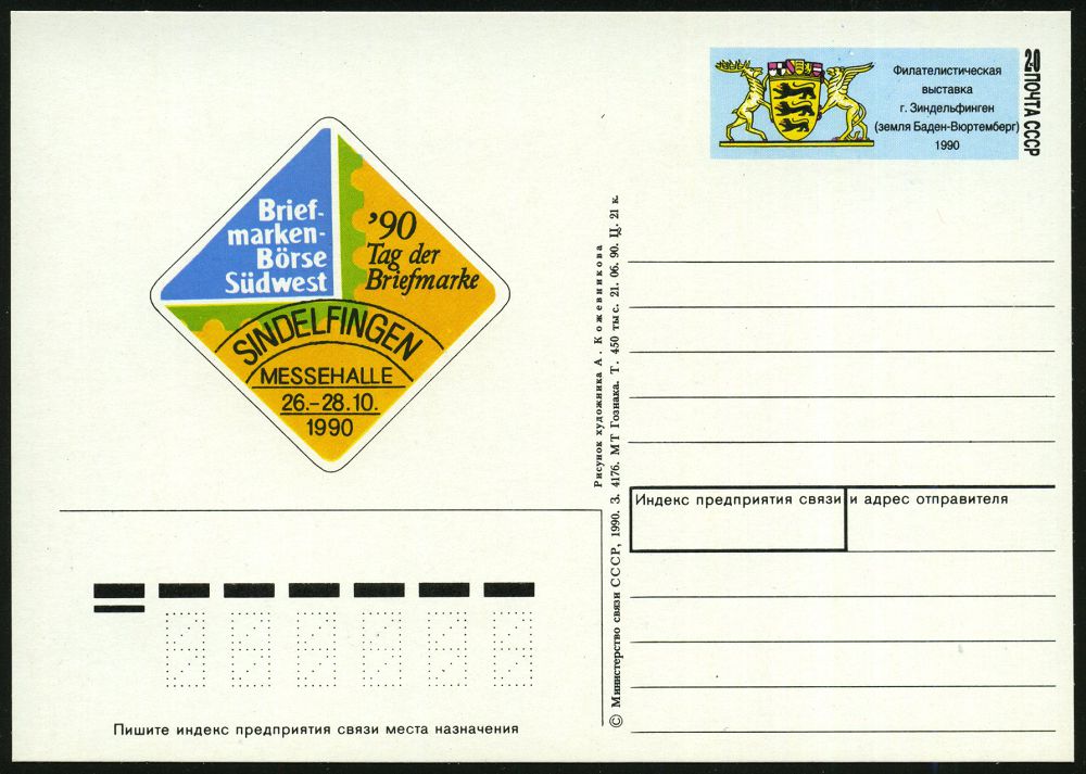3903 | 6 € | POSTLEITRAUM 7000 (OHNE STUTTGART) : UdSSR 1990 20 Kop. Sonder-P.: Briefmarken-Börse Sindelfingen.. Tag der Briefmarke (Logo, württbg.Wappen) ungebr. (Mi.PSo 212) | ![]() | |