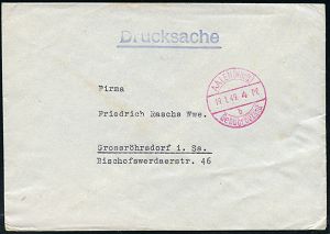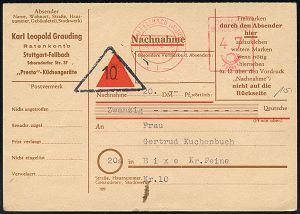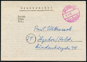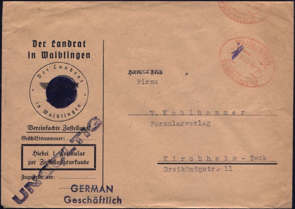3916 | 18 € | POSTLEITRAUM 7000 (OHNE STUTTGART) : WAIBLINGEN/ Gebühr bezahlt 1945 (15.9.) Doppel-Oval-PFS + Paraphe, entnazifierter Dienst-Bf.: Der Landrat.. Vereinfachte Zustellung (NS-Adler geschwärzt) + viol. 1L: UNGÜLTIG (Dü.20) | ![]() | |