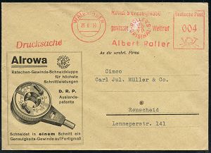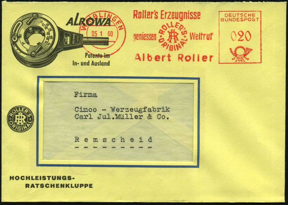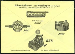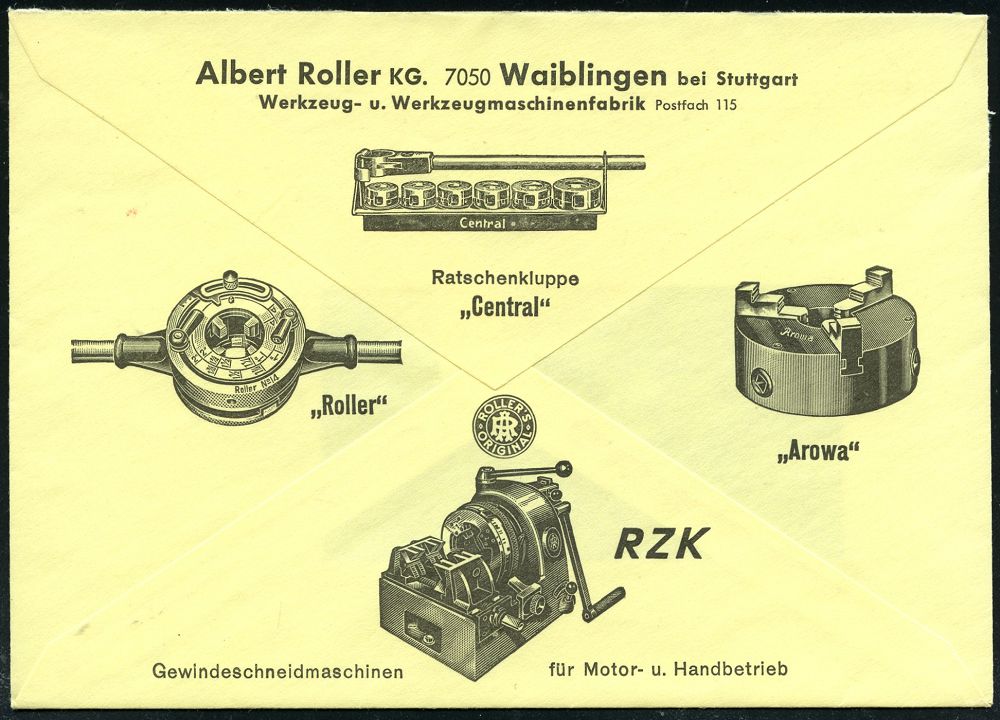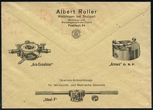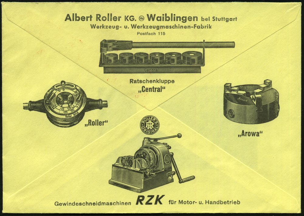 3918 | 18 € | POSTLEITRAUM 7000 (OHNE STUTTGART) : WAIBLINGEN/ Roller´s Erzeugnisse/ geniessen Weltruf/ Albert Roller 1950 (26.6.) AFS Francotyp "Deutsche Post" Posthorn (Firmen-Monogr.) Reklame-Bf.: Alrowa Ratschen-Gewinde-Schneidkluppe.. D.R.P. Auslandspatente.., rs. weitere Reklame! (Dü.E-20CEo) | ![]() ![]() | |