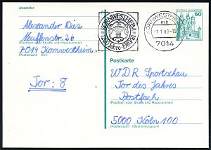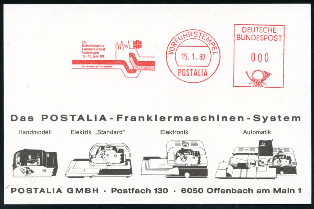 3923 | 16 € | POSTLEITRAUM 7000 (OHNE STUTTGART) : Waiblingen 1980 (15.1.) AFS: VORFÜHRSTEMPEL/POSTALIA/55./Schwäb./Landesturnfest.. (Logo) seltene Postalia-Musterkt.! (= Specimen) | ![]() | |