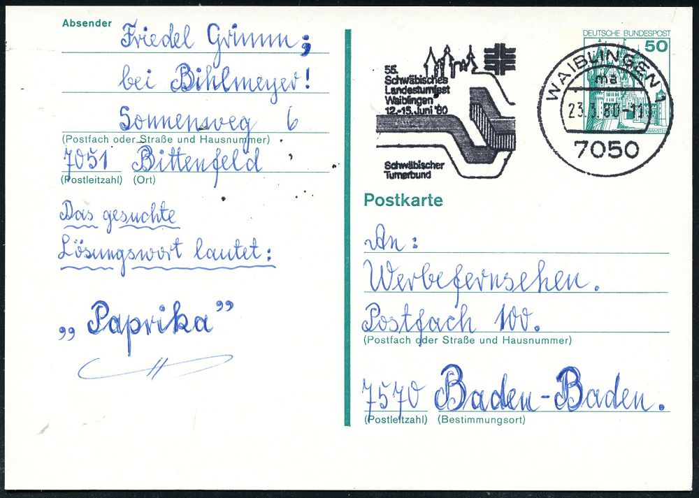 3924 | 5 € | POSTLEITRAUM 7000 (OHNE STUTTGART) : 7050 WAIBLINGEN 1/ ma/ 55./ Schwäb./ Landesturnfest../ 12.-15.Juni 1980 (März) MWSt (Logo) Bedarfs-Kt., vergl. Kat.Nr. 3923 (Bo.11 A) | ![]() | |