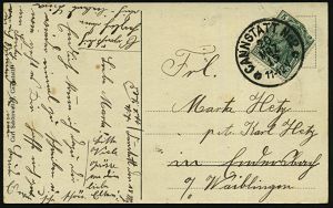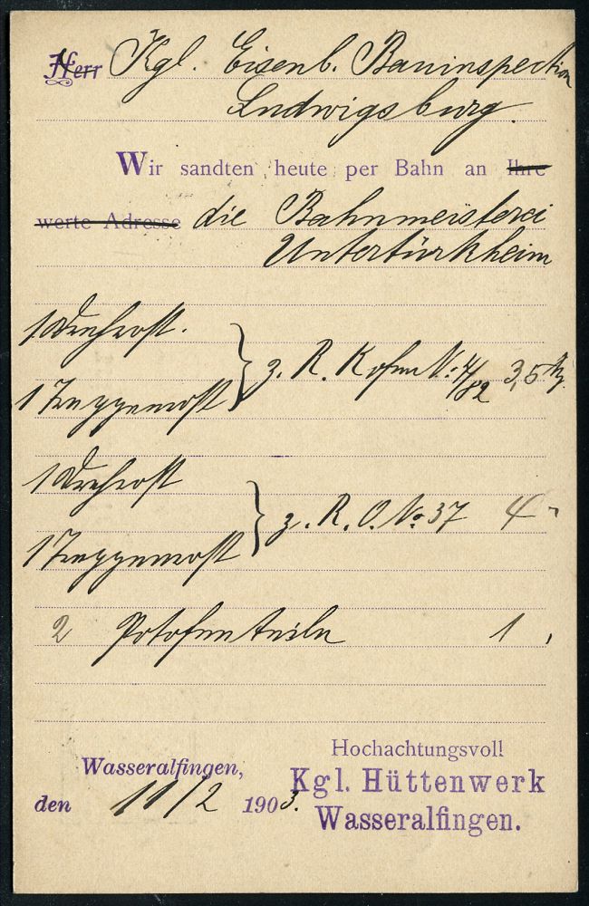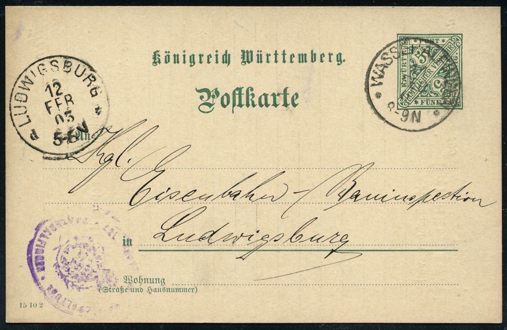 3927 | 14 € | POSTLEITRAUM 7000 (OHNE STUTTGART) : WASSERALFINGEN/ ** 1903 (11.2.) 1K auf Württemberg Dienst-P. 5 Pf. Ziffer, grün m. rs. Zudruck: Kgl. Hüttenwerk , Fernkt. n. Ludwigsburg (Mi.DP 29) | ![]() ![]() | |