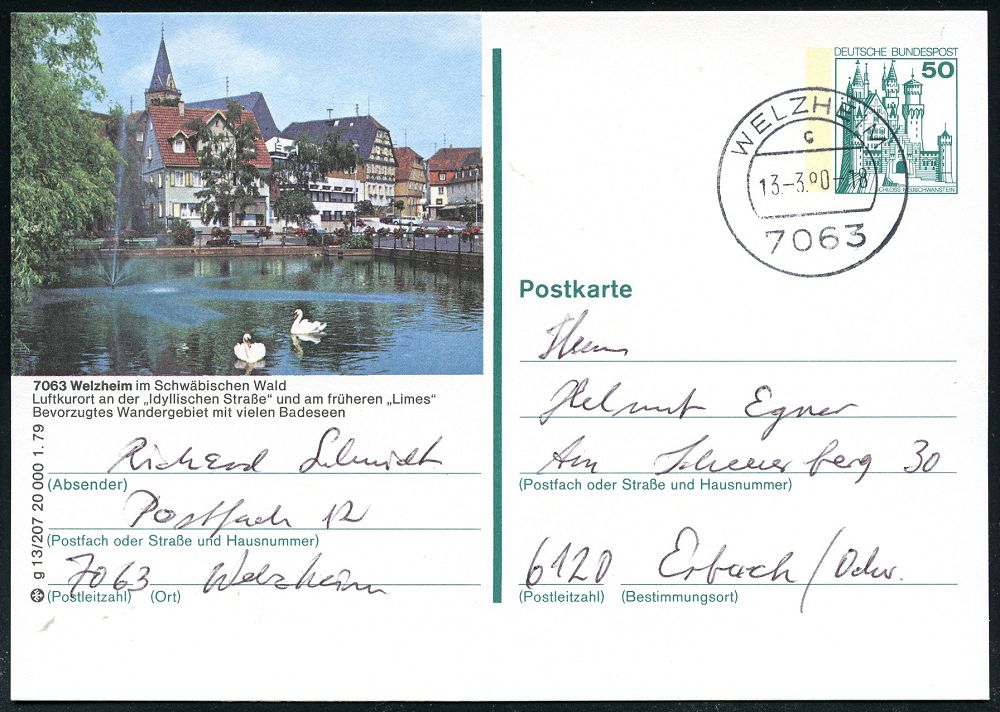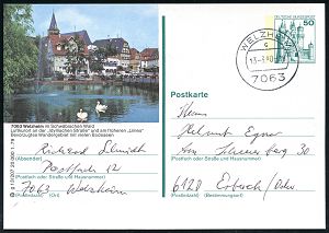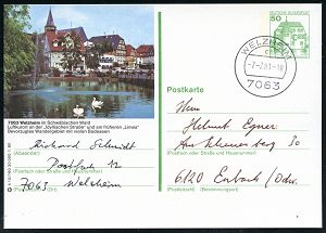 3932 | 12 € | POSTLEITRAUM 7000 (OHNE STUTTGART) : 7063 WELZHEIM/ c 1981 (7.7.) 1K-Segment auf ortsgl. BiP 50 Pf. Burgen, grün: 7063 Welzheim..am früheren "Limes".. Wandergebiet (Ortsbild) seltene Kombination!! (Mi.P 130) | ![]() | |