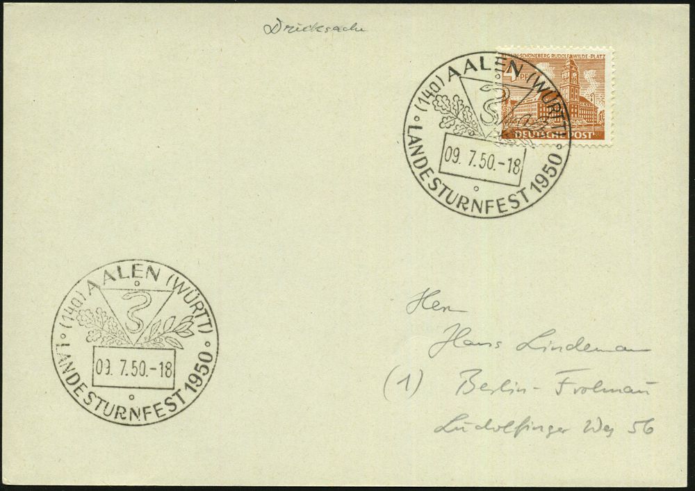 3748 | 12 € | POSTLEITRAUM 7000 (OHNE STUTTGART) : (14a) AALEN (WÜRTT)/ LANDESTURNFEST 1950 (9.7.) SSt (Dreieck mit Schlange, Lorbeer, Eichenblätter) klar gest. Inl.-Drs.-Kt. (Bo.2) | ![]() | |