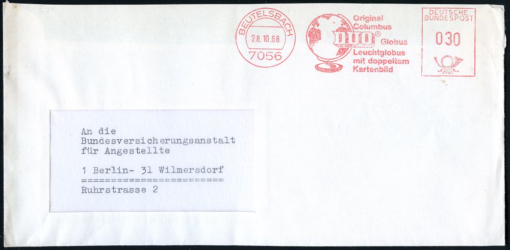 3760 | 12 € | POSTLEITRAUM 7000 (OHNE STUTTGART) : 7056 BEUTELSBACH/ Original/ Columbus/ DUO..Leuchtglobus.. 1966 (28.10.) AFS Francotyp = Globus , Fern-Bf. (Dü.E-23CO) | ![]() | |
