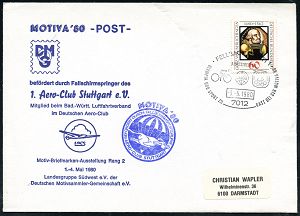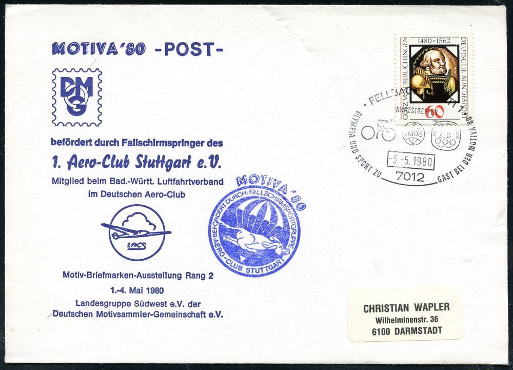 3803 | 25 € | POSTLEITRAUM 7000 (OHNE STUTTGART) : 7012 FELLBACH,WÜRTT 1/ ..MOTIVA 80 1980 (3.5.) SSt + blauer HdN: MOTIVA ´80/ BEFÖRDERT DURCH FALLSCHIRMSPORT-GRUPPE/ AERO-CLUB STUTTGART (Hund vor Fallschirm) Motiva-SU.: ..befördert durch Fallschirmspringer.., rs. 4 orig. Autogramme der Fallschirmspringer, Inl.-Bf. | ![]() ![]() | |