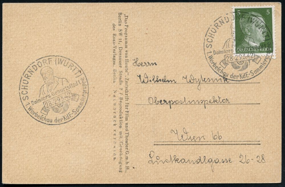 3863 | 25 € | POSTLEITRAUM 7000 (OHNE STUTTGART) : SCHORNDORF (WÜRTT)/ Daimlers Geburtsstadt/ 1.Werbeschau..KdF 1942 (März) SSt = Brustbild G. Daimler mehrfach (schwaches Fleckchen) + RZ: Schorndorf/(Württ), Fern-R-Karte! (Bo.9) | ![]() | |