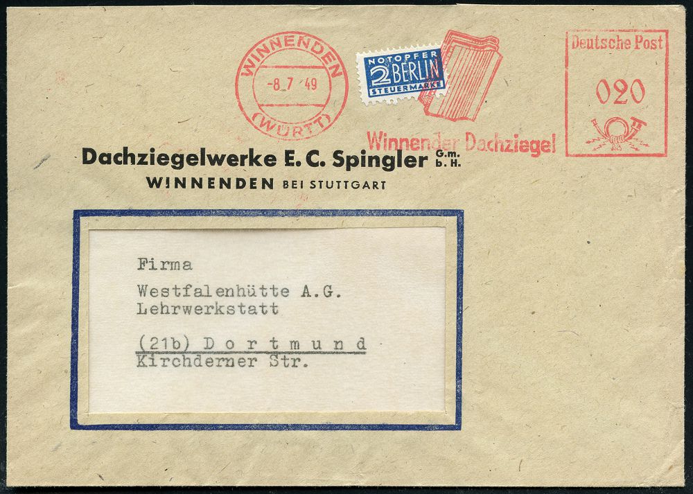 3933 | 15 € | POSTLEITRAUM 7000 (OHNE STUTTGART) : WINNENDEN/ (WÜRTT)/ Winnender Dachziegel 1949 (8.7.) AFS Francotyp "Posthorn" (2 Dachziegel) auf 2 Pf.NoB (? VE) glasklar gest. Firmen-Bf.: Dachziegelwerke E. C. Spingler.. (Dü.E-20CE) | ![]() | |