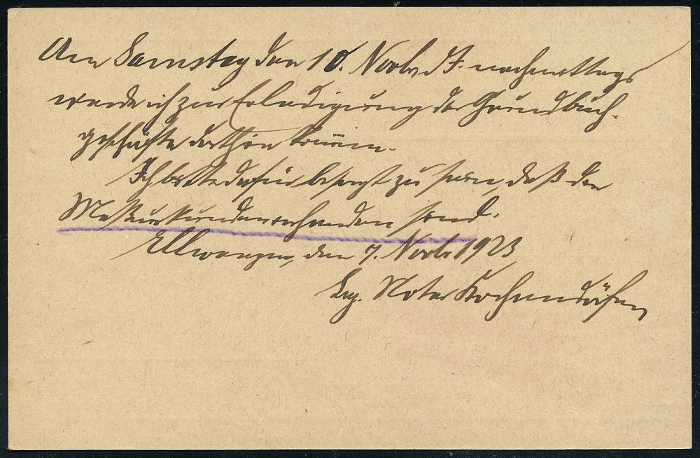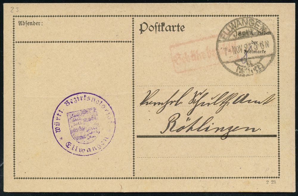 3776 | 15 € | POSTLEITRAUM 7000 (OHNE STUTTGART) : ELLWANGEN/ (Jagst)/ a/ (Württ.) 1923 (7.11.) 1K-Brücke + roter Ra.: Gebühr bezahlt (gotisch) viol. 1K-HdN: Württ. Bezirksnotariat/Ellwangen, Schul-Dienst-Kt. | ![]() ![]() | |