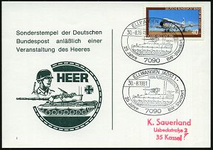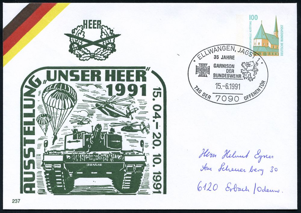 3785 | 10 € | POSTLEITRAUM 7000 (OHNE STUTTGART) : 7090 ELLWANGEN.JAGST 1/ 35 JAHRE/ GARNISON/ DER/ BUNDESWEHR.. 1991 (15.6.) SSt auf passendem PU 100 Pf. Altötting: AUSSTELLUNG "UNSER HEER 1991" = Fallschirmjäger, Helikopter (u. Kampfpanzer "Leopard II") Inl.-Bf. (Mi.PU 290) | ![]() | |