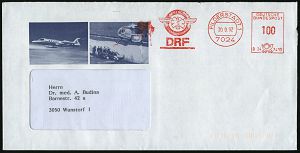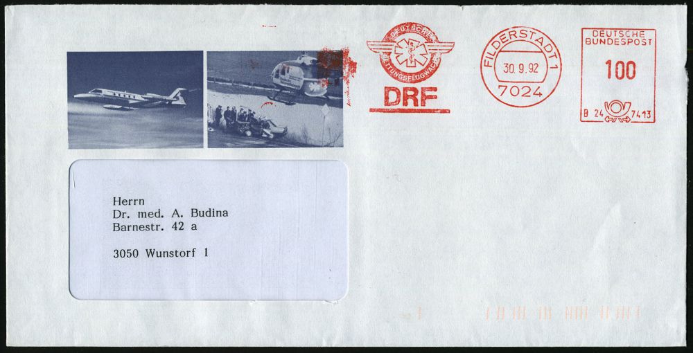 3807 | 12 € | POSTLEITRAUM 7000 (OHNE STUTTGART) : 7024 FILDERSTADT 1/ B24 7413/ DEUTSCHE/ RETTUNGSFLUGWACHT/ DRF 1992 (30.9.) AFS = Flügellogo mit Aeskulapstab (rs. Abs.-Vordruck mit gleichem Logo), passender Reklame-Bf. (Dü.E-26) | ![]() | |
