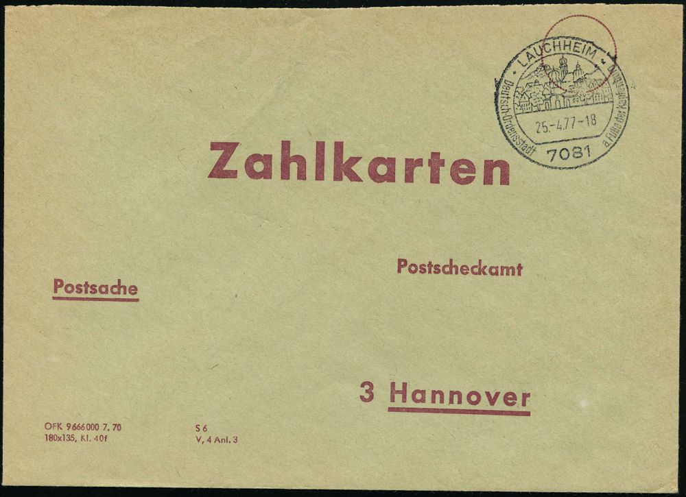 3826 | 16 € | POSTLEITRAUM 7000 (OHNE STUTTGART) : 7081 LAUCHHEIM/ Deutsch-Ordensstadt.. 1977 (25.4.) HWSt (Ortsbild) auf seltenem PSch.-Innendienst-Bf. (braun/grün für Zahlkartenautausch!), seltene Verwendung! | ![]() | |