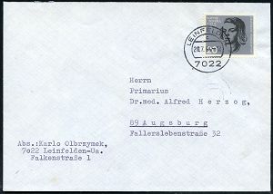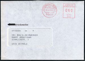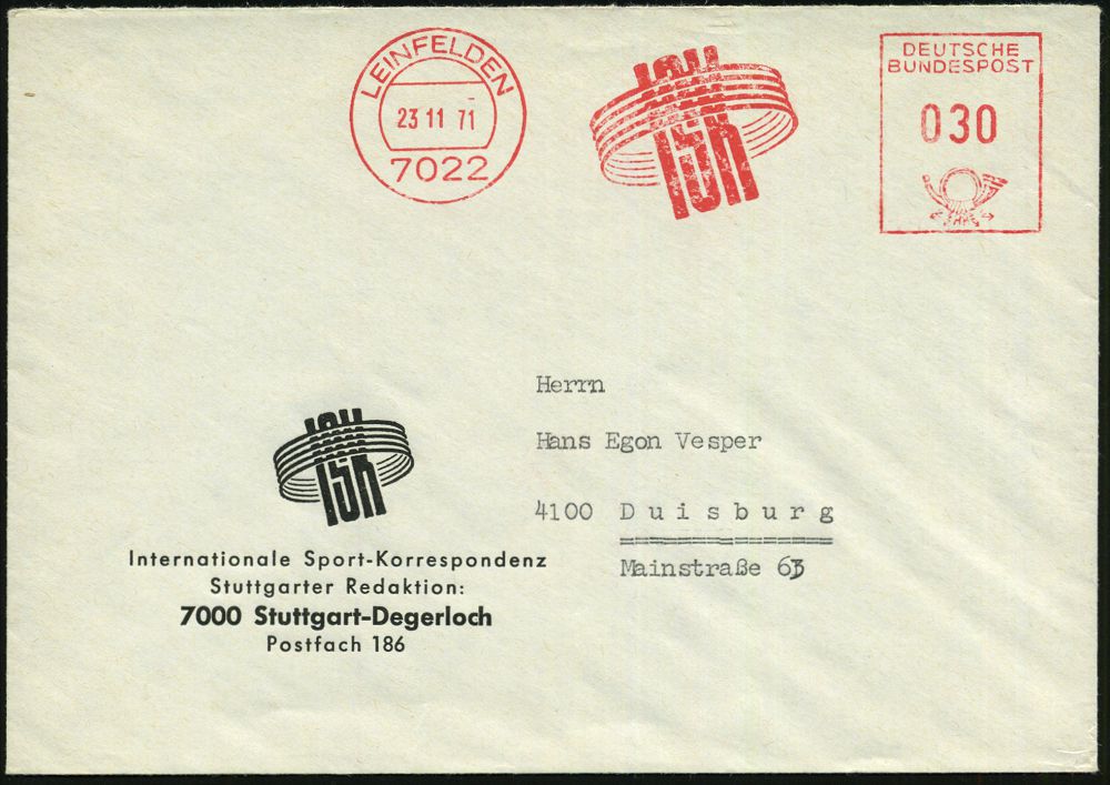 3830 | 12 € | POSTLEITRAUM 7000 (OHNE STUTTGART) : 7022 LEINFELDEN/ ISK 1971 (23.11.) AFS Francotyp (Logo) = Internat. Sport-Korrespondenz, motiv-gl. Inl.-Bf. (Dü.E-23C) | ![]() | |