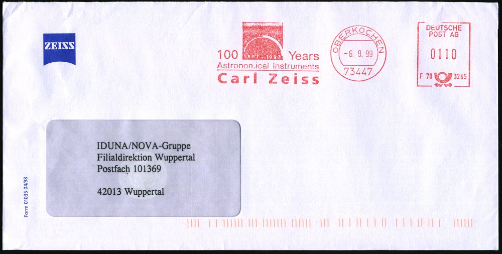 3845 | 10 € | POSTLEITRAUM 7000 (OHNE STUTTGART) : 73447 OBERKOCHEN/ F70 3265/ 100 Years/ Astron.ical Instruments/ Carl Zeiss 1999 (6.9.) Jubil.-AFS "Deutsche Post AG" (Sternhimmel) Firmenbrief: ZEISS | ![]() | |