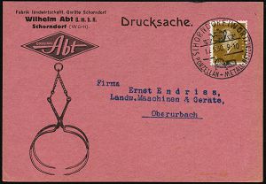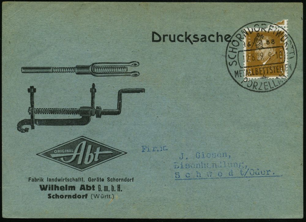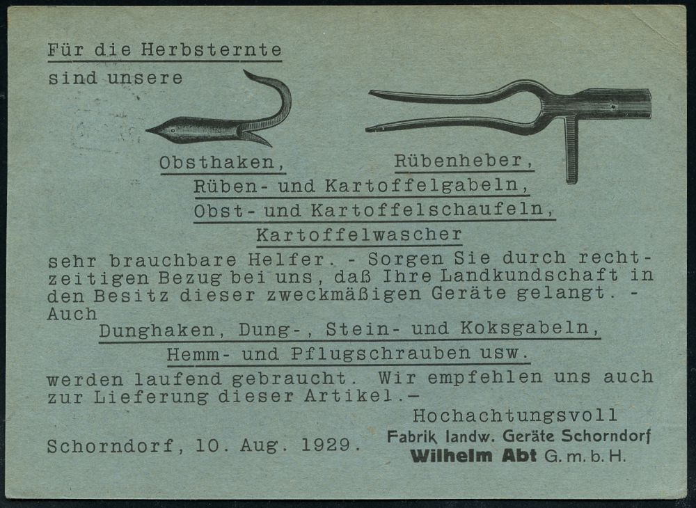 3855 | 20 € | POSTLEITRAUM 7000 (OHNE STUTTGART) : SCHORNDORF (WÜRTT)/ METALLBETTSTELLEN/ PORZELLAN 1929 (12.8.) HWSt (Frau Bürgermeister Walch mit Degen anno 1688) auf Reklame-Kt.: Wilh. Abt. GmbH, Fabrik landwirtschaftl. Geräte (4 Geräte vs. u. rs.) Fern-Kt. (Bo.1, Letztjahr) | ![]() ![]() | |