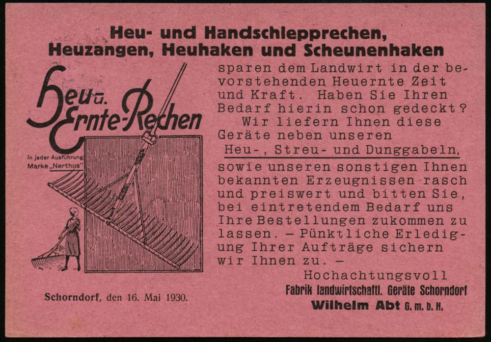 3857 | 20 € | POSTLEITRAUM 7000 (OHNE STUTTGART) : SCHORNDORF (WÜRTT)/ PORZELLAN-METALLBETTEN 1930 (17.5.) HWSt (Keramik-Tassen/-Kanne u. Metallbett) , klar gest. Reklame-Kt.: Wilh. Abt. , landwirtschaftl. Geräte (Heu-Rechen etc.) klar ges.! (Bo.2, nur 1929-31 verwendet) | ![]() ![]() | |