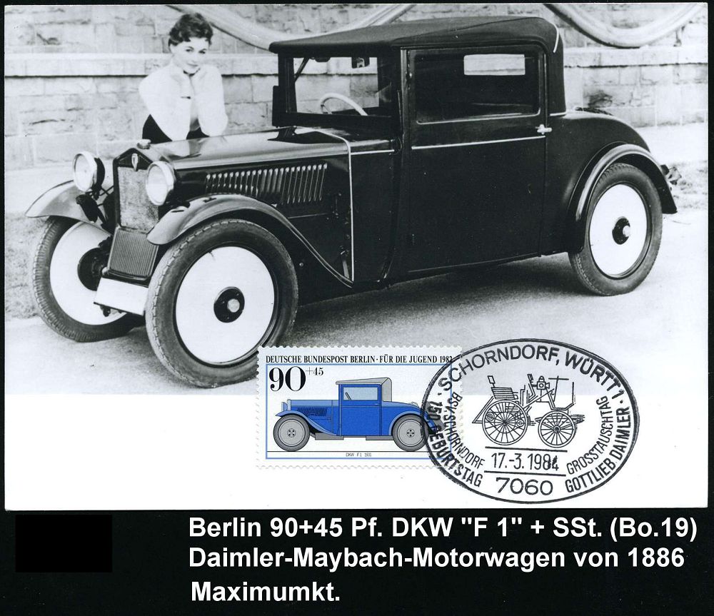 3868 | 8 € | POSTLEITRAUM 7000 (OHNE STUTTGART) : 7060 SCHORNDORF,WÜRTT 1/ 150.GEBURTSTAG GOTTLIEB DAIMLER 1984 (17.3.) SSt (Daimler-Motorwagen) auf Berlin EF 90 + 45 Pf. DKW "F 1", Maximum-Kt. (Mi.663 EF) | ![]() | |
