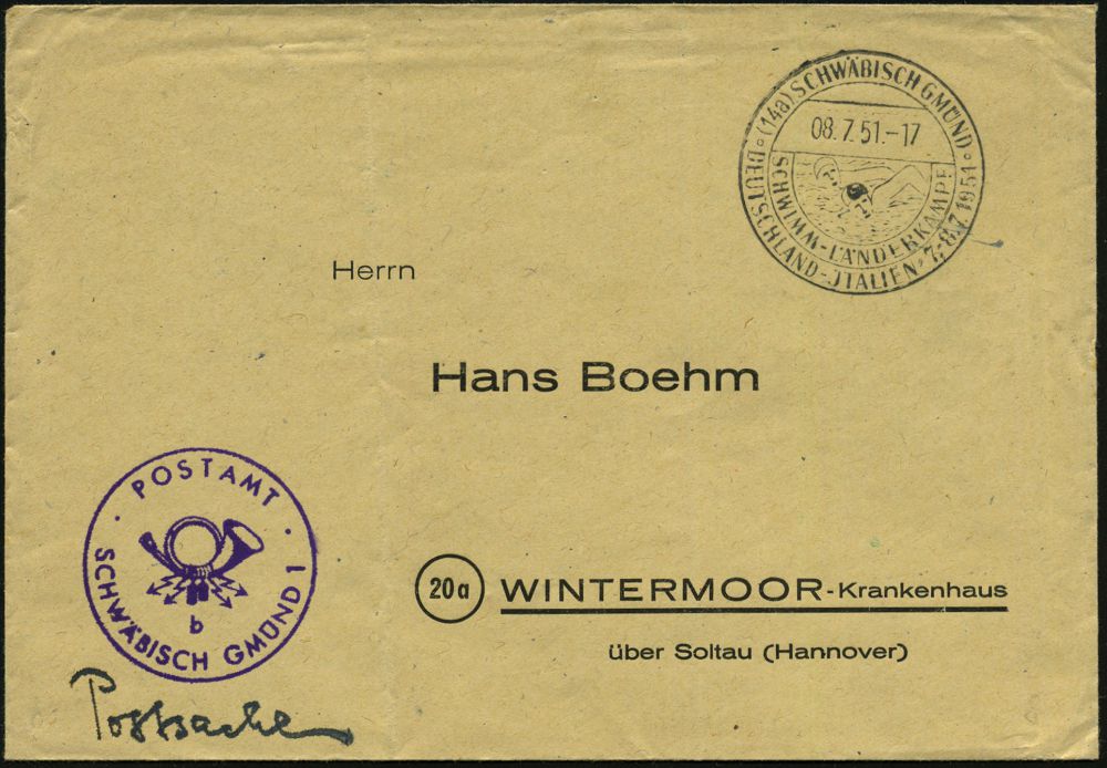 3870 | 15 € | POSTLEITRAUM 7000 (OHNE STUTTGART) : (14a) SCHWÄBISCH GMÜND/ SCHWIMM-LÄNDERKAMPF/ DEUTSCHLAND-JTALIEN 1951 (8.7.) seltener SSt = 2 Kraul-Schwimmer + viol. 1K-HdN: POSTAMT/b/SCHWÄBISCH GMÜND ,klar gest. (gefalteter) Postdienst-Antwort-Bf. (Bo.8) | ![]() | |