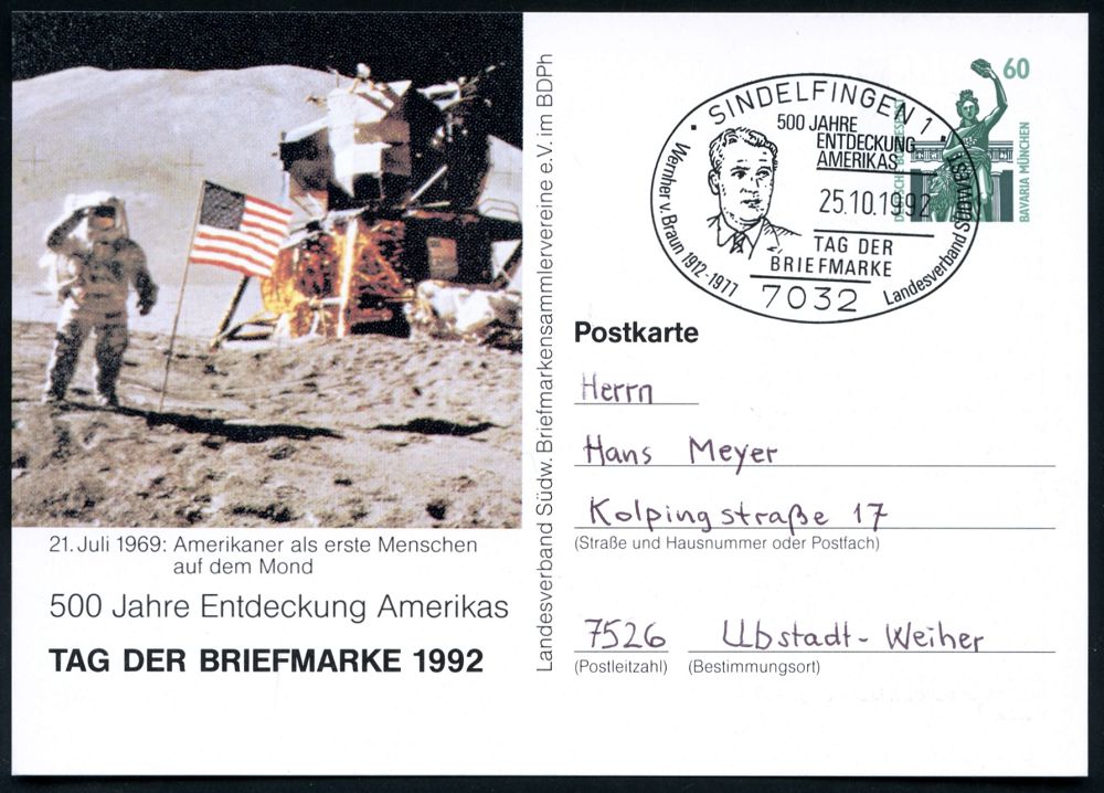 3897 | 12 € | POSTLEITRAUM 7000 (OHNE STUTTGART) : 7032 SINDELFINGEN 1/ Wernher v.Braun 1912-1977../ TAG/ DER/ BRIEFMARKE 1992 (25.10.) SSt = Kopfbild Wernher v. Braun auf PP 60 Pf. Bavaria: 21.Juli 1969, US-Mondlandung (Mi.PP 151) | ![]() | |
