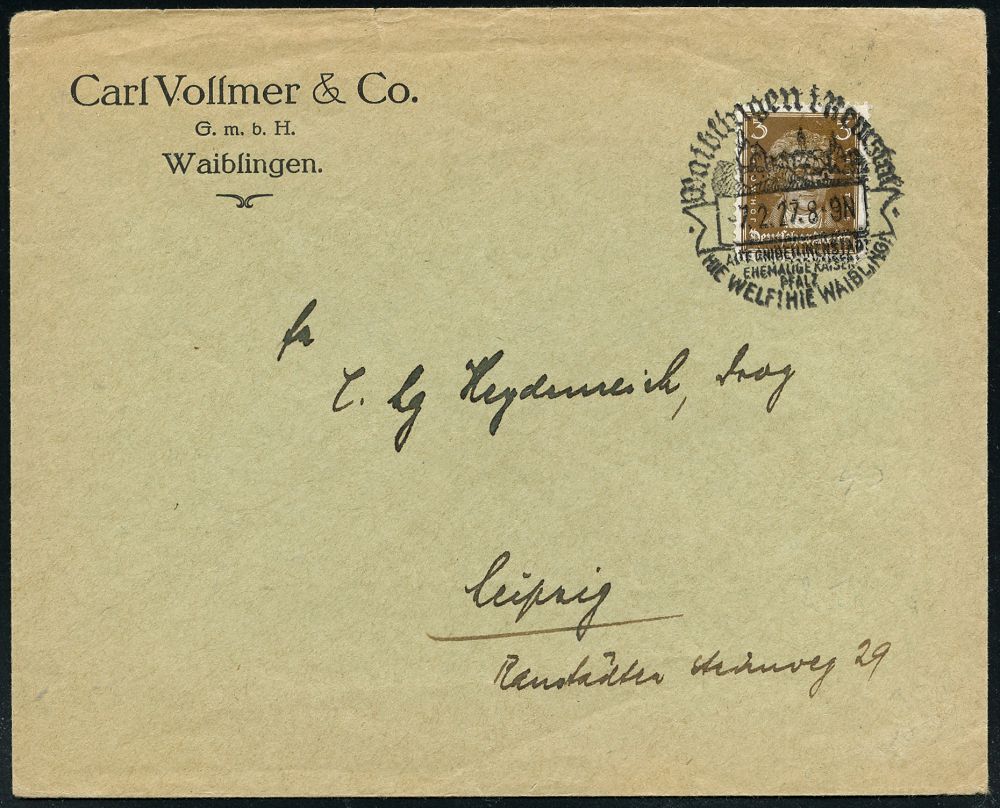 3909 | 16 € | POSTLEITRAUM 7000 (OHNE STUTTGART) : Waiblingen i.Remstal/ ALTE GHIBELLINENSTADT/ EHEM.KAISER-/ PFALZ/ HIE WELF! HIE WAIBLING! 1927 (7.2.) HWSt (mittelalterl. Stadtbild) EF 3 Pf. Goethe, klar gest. Firmen-Bf.: Carl Vollmer & Co.. (Bo.1) | ![]() | |