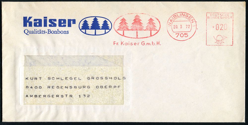 3921 | 12 € | POSTLEITRAUM 7000 (OHNE STUTTGART) : 705 WAIBLINGEN 1/ Fr.Kaiser GmbH 1972 (20.3.) AFS Francotyp (Firmen-Logo: 3 Tannen) motivgl. Reklame-Bf. = Bonbon- u. Karamellen-Fabrik (Dü.E-26) | ![]() | |